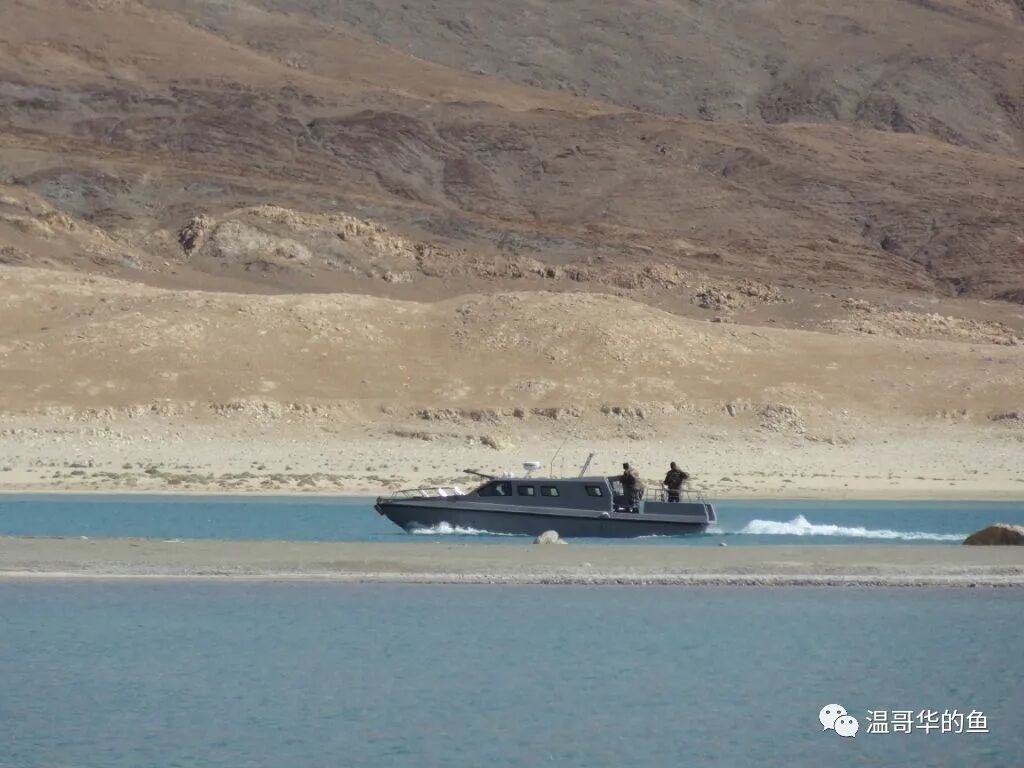 狭长的班公湖名称来自于拉达克语,意思是高高的草原湖,它实际上由5个互通的小湖串联而成,历史上只有最西端这个湖被叫做班公错。整个湖群的藏语名为“错木昂拉仁波”,意为长脖子天鹅(我觉得更像一条冬虫夏草),东西长155公里,南北最宽处约15公里,湖面海拔高度4240米,平均水深22米,最大水深57米,每年有长达6个月的结冰期。班公湖是一座比较罕见的咸淡水混合湖,湖东部有多条河流注入,包括最大的两条支流麻嘎藏布和多玛曲,补给量大于蒸发量,湖水为淡水;湖中段收窄到100多米宽,最窄处仅有5米,这段瓶颈阻止了东西两半水体的交换;湖西部支流稀少,蒸发量大于补给量形成咸水,盐度接近20‰,不过还没达到35‰的海洋平均盐度指标。一半咸一半淡虽然罕见,却不是仅见,比它大得多的巴尔喀什湖也是如此,有伊犁河注入的西半部是淡水,缺少支流的东半部是咸水。这两个湖都曾经属于中国,如今一个变成国际湖泊,一个属于哈萨克斯坦了。班公湖以中印实际控制线为界,西部31.5%面积属于印控克什米尔,东部68.5%属于中国西藏日土县。印度根据1865年私划的约翰逊线认为最窄处以西都属于印度的阿克赛钦,这就是争议的来源,而我国并不承认所谓的约翰逊线和阿克赛钦主权争议问题。近几年中印双方发生冲突的地点都在湖北岸实际控制线附近,下图左上的圆圈处。作为一座典型的构造湖,班公湖岸坡陡峻,两岸的山峰高度在5000-6000米之间,多处山体直接插入湖中,其它地方湖边也只有非常狭窄的岸滩和几处支流形成的小型冲积扇,沿湖通行非常困难。因此战术态势上我军在班公湖是天然要吃亏一些的,从后方主要公路前往冲突地点的路程要比印方长近3倍。陆路难行还可以利用水路,我军在班公湖部署了享誉全军的“第四大舰队”:被官兵戏称为西海舰队的阿里军分区班公湖水上中队,装备有928系列B型、C型和D型高速巡逻艇,均由常州玻璃钢造船厂建造,三种艇型各有特点,搭配使用高效灵活。> 928B型,尺寸较小,乘员5-7人,用于日常巡逻> 928C型长13.2米,配备3台440马力柴油机,航速32.4节,载员23人,用于人员和物资运输