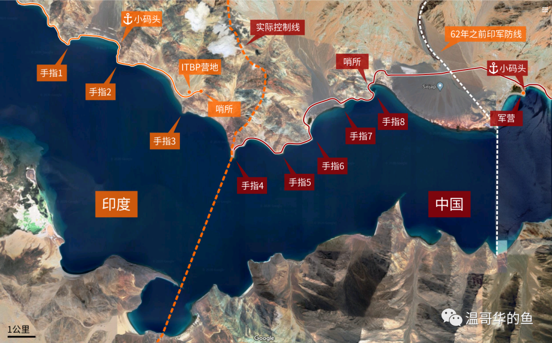 在印度的新闻报道中,通常把冲突地点称为F4,这既不是美国战斗机的名字也不是昔日的台湾男团,而是指班公湖北岸8个山体突出在湖中的小半岛,印度人称之为Finger - 手指,从西到东依次编号为F1 - F8:在1962年反击战之前,印军哨所设置到上图白线旁的西里扎普(Sirijap),反击战中我军占领了这个冲积扇,并在图右那个小湖湾内设立了一个带小码头的哨所,我军巡逻队最远巡逻到手指4,因此我方认定的实控线就沿着手指4的中线通过。直到2011年前,印方负责这一带防守的印藏边境警察(ITBP)哨所还远在班公湖最西端的弗布朗(Phobrang),离手指4有40多公里。但手指4和我方那个哨所之间并没有任何障碍或者标识,印方巡逻队会一直巡逻到手指8,再往前,不敢走了。印方据此认为实控线仍在62年印军防线位置,因为此线以西我军没有哨所,也就没有实控(这脸皮比墙还厚,他们的哨所离开40公里也可以把这里算实控,我们离开10公里就不算实控)。中印巡逻区在手指4和手指8之间有重叠,但双方巡逻分队的领队都会小心地避开对方,绝大部分时间都是你巡逻你的,我巡逻我的,大家心照不宣,和平相处。水上巡逻艇也有双方约定好的接触机制:如果另一方进入本方水域,会派出相同数量的舟艇应对,在相距6米的地方停下,展开红底白字的双语横幅并喊话:“您已在中国/印度水域。”对峙10分钟后换另一组横幅“为了和平和安宁,我们将返回己方,相信你们也会照做。”然后鸣金收兵,各自回营。虽然画面看着莫名喜感,但对双方军人而言这是极为严肃的执勤程序,在不失尊严的同时有效避免冲突。> 在相当长的时间里,中印边境大多数地区还是相当平静而友好的,驻守在如此高寒险恶环境的边防军人并不希望使用暴力2013-2014年间,印度将前线公路修到了手指3,ITBP在那里设立了一个营地和哨所。我方认为此举破坏了过去双方达成的边境管控协议,解放军开始封闭手指4和手指8之间的区域不让印军巡逻队通过。过去见面握个手打个哈哈,如今变成了经常性的互相顶牛不让过,最终在2017年8月15日演变为一场暴力混战,著名的“飞踹”就发生在那次。