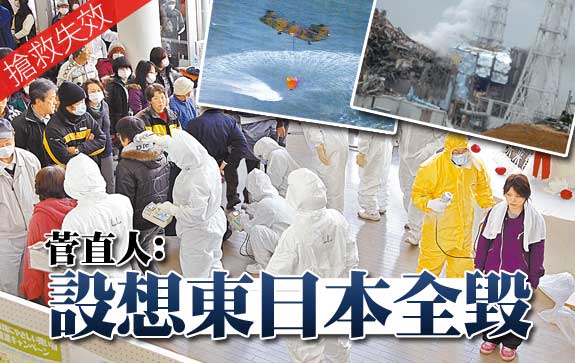日本上周五歷经9.0大地震后,福岛核灾持续恶化,已成最迫切的危机,福岛第一核电厂冷却系统震坏,险象环生,昨早四号炉又传火警,留守人员一度弃守。日 本《每日新闻》指出,首相菅直人昨晚说:「万一真的发生最糟糕的状况,连东日本都毁了的状况也得设想好才行。」他指责东京电力非常没有危机感。法国核安专 家则指「未来48小时是关键时刻」。 菅直人昨晚在官邸与内阁府特别顾问是笹森清会谈时,表达出东日本可能全毁的危机感。 福岛核电厂6个反应炉,爆炸起火不断传出,昨清晨4时许(台湾时间),四号炉所在的建筑物角落又传火警,上午9时许,叁号炉也因为过热冒烟,电厂上空冒出的大量白烟很可能是含有辐射物质的水蒸气。
