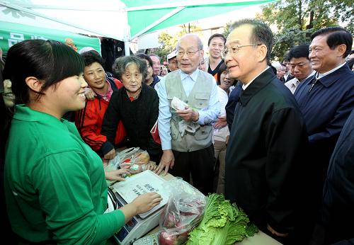 10月1日,温家宝总理来到北航社区菜场的菜摊前,人们井然有序地排队购 买。土豆8毛、芹菜8毛、白菜6毛……温家宝走到一个个摊位旁,与卖菜的农民、排队的市民亲切交谈,详细询问蔬菜品种、价格等问题。这一天,经过微博调 查,全国大中城市芹菜价格没有低于2元的,上海普通菜场是4元,大型超市是6元。后经了解,北航社区只有那一天是8毛钱。