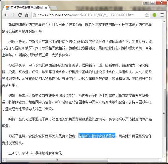 来源:万维博客 作者:lone-shepherd 据新华社电 国家主席习近平6日在印尼巴厘岛会见了新西兰总理约翰·基。约翰·基向习近平通报了新方处理恒天然集团乳制品质量问题情况,表示将采取严格措施确保产品质量。习近平强调,食品安全问题事关人民身体健康,希望新方把好食品质量关,切实维护两国经贸合作良好发展势头。 习主席,牧人有一个问题请教:您是国产奶粉喝多了还是在官场打滚打得只会说套话了?