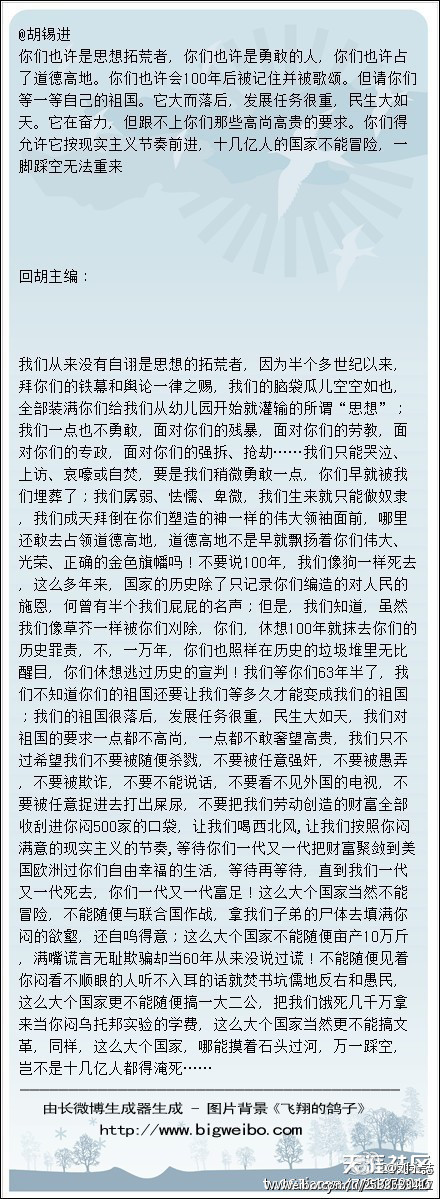 来源:万维博客 作者:何岸泉 习总日记(2013,11,19-2) 秘书来报,告芦笛对本人用词遣句流露出大不敬。我拿来一瞧,火大起来,什么“十分满意”,完全没有把我习总近平放在至高无上的地位,反而使用老师对学生长者对后生的口吻说:“近平啊,刚才细看了《决定》,与《公报》截然不同,觉得十分满意。” 我党开会,我做报告,我解释《决定》,要你这个远在异邦的思想家“十分满意”作甚?我党开会排排坐吃果果,管你屁事?最讨厌死乞白赖替党瞎操心单相思的人,尤其是男人。 我党的历史和传统,向来是重敌人轻朋友,最憎恨投靠投降投奔来的朋友,却敬重坚决与我们为敌誓不两立不共戴天的敌人。 譬如国民党里,我们最敬重蒋介石,蔑视在国共内战中投降我们的国民党高级官员。为了替老蒋出气,我们在毛主席英明指挥下,借助三反五反反右文革等运动,干掉了那些国民党的叛徒。 譬如外国里面,我们最敬重美帝英法德等老牌帝国主义国家,最鄙视曾经同为社会主义大家庭里面的兄弟国家。 譬如同胞里面,我们最敬重抛弃社会主义祖国移民海外的人,最轻蔑回到祖国参加社会主义建设的海归。在文革我们干掉不少海归。 十八届三中全会后,很多人又开始燃起贱骨头之火,发表令人恶心的吹捧献媚文章。芦笛就在众多穷酸迂腐之一。上次芦笛来京求官未能得逞,回去之后怀恨在心,使劲骂我“低智商加十三点”,还开洋枪打洋炮“Better to remain silent and 瞧他现在,什么“已经是很了不起了”,“而最结棍的改革措施是把地方司法权划归中央直属,减轻了地方党政法串通一气贪腐的弊病”,“就灰常灰常了不起了”,“只怕是个人独裁还更有效些,少了许多掣肘与扯皮”等等,显得那么迫不及待地拍马屁献媚舔菊。告诉你们,我习总近平非常鄙视这种拍党马屁为党唱赞歌的华侨。 可怜中国人啊,好不容易出了一个“思想家”芦笛,没想到是如此混蛋透顶愚昧不堪的花痴加白痴。 ----------------------------------------------------------------- 刚才细看了《决定》,与《公报》截然不同,觉得十分满意 芦笛 改革不能操之过急,得一步步来,而《决定》计划采取的那几步措施已经是很了不起了,诸如废除劳教、允许私人办银行、土地流转等等,而最结棍的改革措施是把地方司法权划归中央直属,减轻了地方党政法串通一气贪腐的弊病。