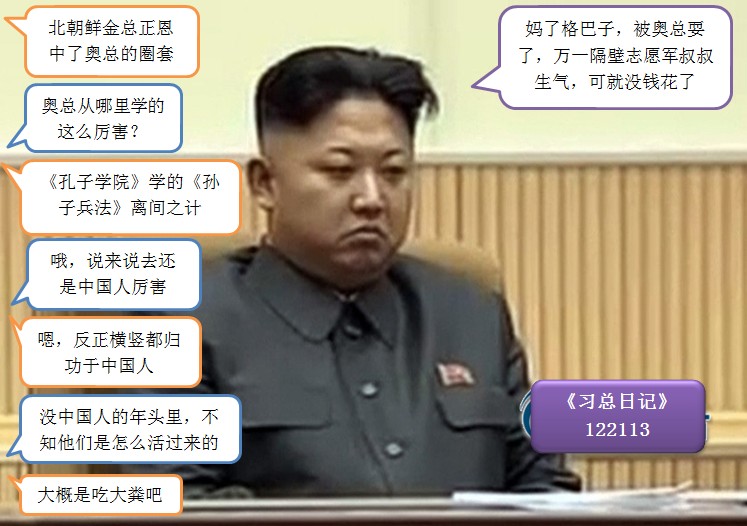 来源:万维博客 作者:何岸泉 习总日记(2013,12,21) 昨天讲到美国对北朝鲜耍流氓,今天继续。 美国全称是“美利坚合众国”,绰号是“超级大流氓”,翻译成洋文是“Supermen”。美国靠俩独门神功傲视群雄,一种说法是“民主和自由”,另一种说法是“美元和航母”。其实他的国名“美利坚合众国”已经摆明了他的态度,对其他国家的态度:美(美元)利(利益)坚(坚强)合(统合)众(大众)国(国家),串连起来的解释是:以强硬的姿态追求以美元为载体的利益并统合其他国家在自己周围。 美国的耍流氓行径,说得再白一点就是:以维护他自身利益为目的整合世界的行为。如果任其发展下去,世界将会被美国统一。这个结果,估计最大反对者是追求“统一”的各国民族主义者。人的思维就是那么滑稽,最反对世界“统一”的恰恰是最赞同各国“统一”的人。同理,支持世界“统一”的人,也将是反对各国“统一” 做个假设,台湾岛上反对与西朝鲜中国统一人士,可能不反对与美国“统一”,若台湾与美国“统一”后,中国也与美国“统一”,不知道台湾那些反对与中国“统一”者会如何感受? 不过我认为赞同秦始皇统一六国的人,不应该反对任何形式的统一。要知道秦始皇当时是以武力方式消灭六国统一中国的。 说到这里,可能有读者有兴趣问我:“习总近平,你对统一是怎么看的?”或者直接了当地问:“习总会赞同武力统一台湾吗?”对这种问题通常我采取不回答的方式。但我可以告诉你们,若台湾宣布更改国名和版图,我就会声势浩大地动用军队,作准备武装干涉状,然后等美国发话阻止。美国的话就是台阶,美国的话也是筹码。我会让祖国人民知道,如果解放军出兵解放台湾,美军一定会出手阻拦,根据双方军事实力,解放军现在还打不过美国,我们要卧薪尝胆,我们要高喊“君子报仇十年不晚”口号,背诵“相信后代比我们更有智慧”的教导。 什么叫“马列主义毛泽东思想”?就是凭一张嘴,能把死人说活的学问。我习总近平在清华就专攻马克思主义理论和思想教育的。 兜了老大圈子总算开始讲美国对北朝鲜耍流氓了。 北朝鲜想投美国的怀送美国的抱,可是他的冤家南朝鲜已经与美国勾当成奸,美国想答应却无法答应,怕南朝鲜吃醋闹上吊,有损美国名誉声威。流氓也讲名誉,尤其是超级大流氓美国。没办法,美国就骗北朝鲜的金总正恩,说只要你把西朝鲜中国在北朝鲜的代理人张成泽以及亲华帮全部撸了,我就明媒正娶,八人大轿把你娶回家。 这金总正恩心里嘀咕却没其他选择,无奈何只能相信奥总巴马。为了投名状交得漂亮,金总干脆坏人做到底,杀了姑父张成泽及其亲华派。没想到事成之后美国大流氓奥总巴马耍流氓否认曾答应接纳北朝鲜为妾,这可把金三气得哇哇大叫。因为,西朝鲜中国万一恼羞成怒断了军援粮援金援,他金总该如何向老爷老爹老姑父交代啊! 还好,我习总近平遵循“以德报怨”的祖训,别人一个耳刮子过来,我迅即奉上另一边肉嘟嘟的嘴脸,即便是被打得满地找牙,我也要默诵“子在川上曰,鸡鸡复鸡鸡”。