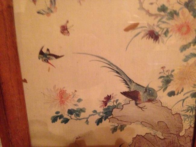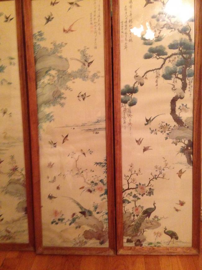 元旦节假,给老婆当车夫,驱车200英里去一处古玩市场,市场由一处老火车站改建,占地几万呎,几百个商家。逛了一天,没什么收获,临近商场打烊,在一个角落里发现四副中国屏风画,典型的传统花鸟工笔画: