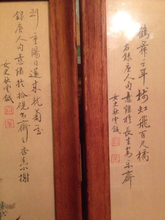 仔细端详,画工细致,色彩莹润,画框剥落陈旧,有些年头了。让人惊奇之处是每副画都有题字和落款。 题字为小楷隶书,字迹华滋遒劲,结体秀美,点画之间呼应紧密。柔润而坚强,形体端秀。 落款为 ”女史秋云“。