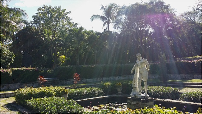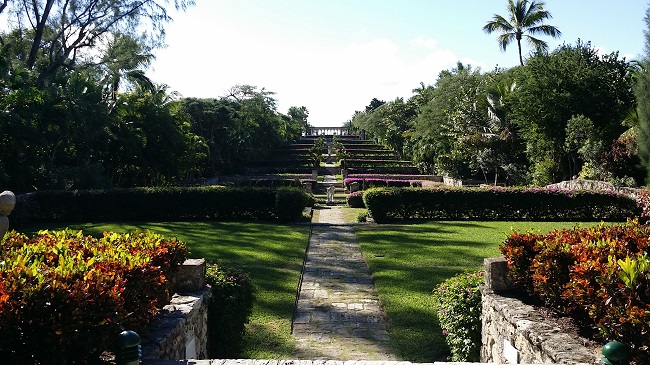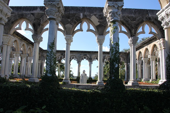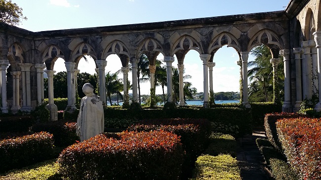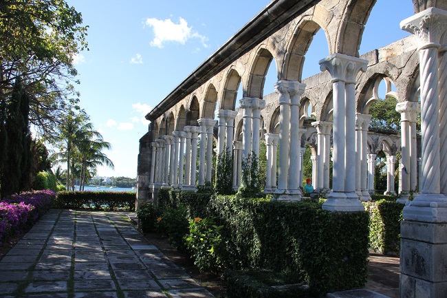 它,静静地伫立在小丘上,并不轩然,却让人仰视。拾级而上,步步惊艳。这是一座方形迴廊,拱形的额枋,斑驳的石墙,洁白的大理石柱,雕饰华美的雀替,攀缘缠绕的藤蔓,围着一方小小的花园。修剪齐整的灌木中,立着一尊秀美的少女雕像,抬手唇边,蹙眉低头在沉思,不由得令人放轻了脚步。上午的阳光从南方的天空斜斜地洒下,在柱影和枝叶中变得细碎平和。漫步迴廊中,每一处细节,每一个角度,都显得那样完美。 穿过迴廊向南,翠绿的草坪,长长的石板路,一直引向碧蓝的港湾。草坪尽处有一座凉亭,镂空金属圆顶,从内仰望青天,但见缠枝蔓草,婉转往复,几欲忘今夕何年。回头再看坡顶的迴廊,更觉一派古意扑面而来。 这个美轮美奂的Cloister,究竟什么来历? 迴廊的下方有一方石碑,上面这样写道:“This Cloister was built in the XII-XIII centuries, Montrejau, France by the Augustinian Order. It was rebuilt in 1968 by J.J. Castremanne for H.Hartford. Architect J.L.Volk”. 我看了还是一头雾水,不明就里。 旅行归来后,我查了不少资料,才算弄明白事情的来龙去脉-- 原来,这座迴廊始建于十二到十三世纪,原本属于法国南部蒙特雷诺的一所奥古斯丁修道院。在修道院建筑中,迴廊往往处于中心位置,是僧侣或修女们静思冥想的地方。1920年代,美国传媒大王赫斯特从法国买下这个修道院,把这个建筑拆散了运回美国,本来想运到加州他那座著名的赫式庄园重建,却不知为什么没有实施,这批古老的石材一直静静地躺在纽约港的仓库里。1959年,美国A&P食品公司的继承人亨廷顿.哈特福德买下了Nassau的“猪岛”,改名天堂岛,并开始在岛上大兴土木。为了给天堂岛增添一些典雅和美丽,哈特福德从赫斯特手里买下仓库里那些沉睡多年的石材,运到巴哈马。可是用于最初胡拆乱放,石材构件都没有编号,也没有任何组装说明,没有人知道该怎么把它们重新拼凑起来。直到哈特福德请来古建筑专家、比利时人Castremanne,问题才迎刃而解。1968年,这座来自地中海的中世纪迴廊,在Nassau港边重新建成,从此在加勒比之滨幽幽呈现它的美丽。