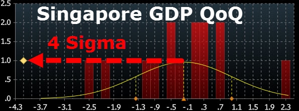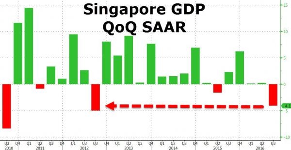这次来真的,有GDP数据为证。一个亚洲国家经济崩盘了,它就是号称为“亚洲四小龙”之一的新加坡。 在经历连续两个季度的低迷后,新加坡经济最终在第三季度出现断崖式下跌。相对于外界此前做出的保持不变的预期,第三季度该国GDP总值环比暴跌4.1%——是自2012年第三季度以来,表现最差的一次。新加坡金融管理局(MAS)表示,并不期望本国GDP增长在2017年出现“显著”回升。 ![]() 新加坡本季度GDP环比暴跌 新加坡第三季度的经济表现,远低于所有14位经济学家给出的最低预测值,而且与这些预测值存在4个标准偏差的统计差距。 ![]() 相差4个标准差 根据彭博社报道,从去年1月份开始,经过三次货币宽松政策的实施后,新加坡央行现在决定,即使目前的经济下降程度为四年之最,但目前的货币政策仍然要保持不变。 彭博社对24位经济学家中的21位进行调查,他们预测,新加坡金融管理局应该会继续坚持自己零利率的货币中立立场。而新加坡贸易部在一份单独报告中表示,第三季度,本国GDP总值下降4.1%,而第二季度曾出现0.2%的微弱增长。 Saktiandi Supaat是新加坡马来亚银行(Malayan Banking Bhd)外汇研究部门的负责人,他表示:“这种技术性衰退不会在明年长期持续。”此外,在新加坡政府新的决策出台之前,他还认为:“新加坡核心通胀仍然保持稳定,而一些经济风险征兆也开始出现。该国目前施行的货币政策应该也不会出现变化。” 目前,新加坡货币新元表现也是一团糟……在经过不降息政策造成最初的一次虚高后,现在新元已经跌回8个月以来的最低点。 ![]() 新加坡币兑美元 |