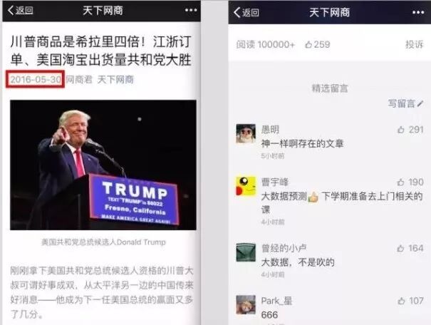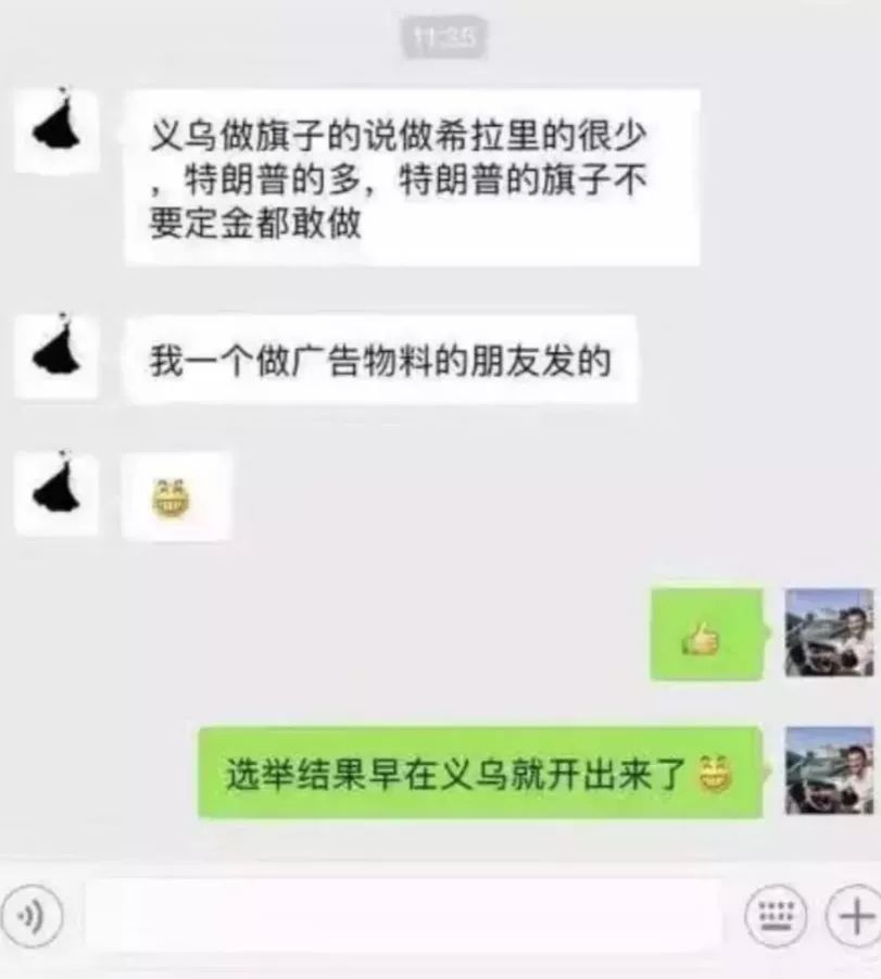 可以这么讲,无论西方媒体再怎么抹黑川普同志,义乌这消息一出,川普基本稳了! 因为,在2016年美国大选上,美国人自己还在战战兢兢地等待大选成果的时候,义乌商贩就通过美国订购的旗帜和衣衫的数量,提前5个月预测出川普将成为总统的。 ▲2016年11月选举结果出来,而中国商贩早在5月份就知晓结果啦 2016年特朗普竞选成功后,一位名叫姚丹丹的义乌老板在接受采访时说,其实早在结果出炉的前五个月,他就知道特朗普很有可能将成为美国总统。 ▲通过美国的订单分析谁能当选总统 在2016年美国总统竞选结果出炉的五个月前,姚丹丹同时接到了特朗普和希拉里竞选产品(旗子、标语)的订单,这位老哥估计了一下双方的数量对比,发现与川普相关的产品订单要远多于希拉里,而后续订单也是川普的要比希拉里的多。 因此,这位老哥他便囤了大量关于川普竞选产品的货,到了竞选结束,仅和川普相关的旗帜就卖出了25万面,大赚了一笔。 |