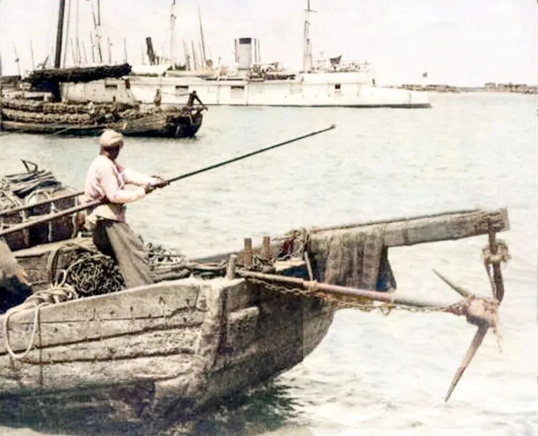 仔细看这张照片,在一艘渔船的远方,居然有军舰。
