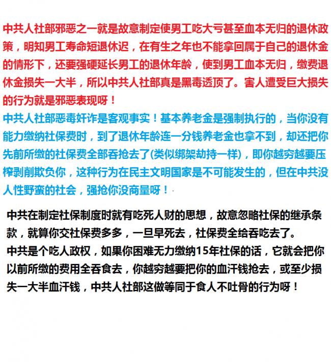 用AI或Grok搜索"50岁退休比60岁退休多拿多占50万元钱以上",得出的结果就是"多拿多占50万元钱并不确定,但用寿命短的社保金养活寿命长的人是事实",也就是讲,寿命长的人要吃寿命短的死人财了,这样的社保设计真是无德无良无人性了!中共明知普通男性寿命短而故意设计成这样吃死财的社保制度,可见其邪恶的性质了。 15年社保费一分钱都不能少!但能否拿回15年退休金呢?中共却毫无兑现承诺,中共就是用诈骗来治国。或许寿命长的人能拿回一部分退休金,但却遭受巨大损失呢,这个损失却被中共人社部无情地吞食去了,所以话中国人的权益是毫无保障的,大家应该知道中共社保的害人性呀。