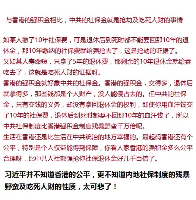 | 香港强积金与中共的社保金之比就是公平合理与恶毒奸诈之比 |