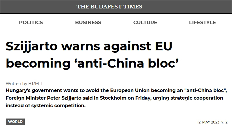 被说“在欧盟奉行亲华路线”,他回应亮了(观察者网讯) 在中美关系波动的背景下,受美国政策影响深远的欧洲也在尝试调整对华政策。当地时间12日在瑞典斯德哥尔摩举行的欧盟外长非正式会议上,欧中关系就是议题之一。 综合《布达佩斯时报》和俄塔社报道,匈牙利外交部长西雅尔多当天敦促欧盟与中国进行战略合作而非“系统性竞争”。针对有关他试图在欧盟奉行“亲华路线”的“指责”,他反驳指出,对华贸易的最大受益国并不在匈牙利所在的中欧,恰恰是在西欧。 《布达佩斯时报》报道截图西雅尔多在会议间隙的讲话中提到,尽管存在外部和内部的努力试图将欧盟变成“某种反华集团”,但匈牙利绝对希望避免这种情况。“个别欧洲国家企图将中国定义为系统性竞争对手,这种做法我们完全不同意。”他表示,布达佩斯认为,欧盟应该致力于同中国进行战略合作。 针对他试图在欧盟奉行“亲华路线”的“指责”,西雅尔多反驳道,对华贸易的主要参与者不是匈牙利等中欧国家,而是西欧国家。他指出,去年欧中双边贸易额达近8600亿欧元,其中德国、法国和意大利占46%。 据报道,西雅尔多还强调,中国现在的国内生产总值(GDP)已经超过了欧盟。2010年,中国在全球GDP中所占比重为9%,欧盟是22%;而如今的情况发生了变化,中国占比已经达到18%,欧盟则降至17%。 西雅尔多表示,西欧国家想要切断欧中之间的经济联系是没有意义的,并举例称汽车行业已经出现了“东西方之间的明确分工”,西方公司生产电动汽车,而东方公司为其制造电池,“两者缺了哪一方,都无法继续工作”。 “我们建议政治不要对此(经济)加以干涉。”西雅尔多说,“让我们让这种在理性、合理的经济基础上建立的劳动分工发挥作用,这样欧洲经济区和中国都能从中充分获利。” 西雅尔多在欧盟外长非正式会议间隙讲话。截图来源:匈牙利M1电视台此外,针对乌克兰危机,西雅尔多认为,欧盟仍然被一种“战争气氛”所支配,大多数成员国希望继续向乌克兰提供“一切所需支持”,但“不幸的是”主要都是军事支持。他表示,匈牙利呼吁尽快实现停火,并通过外交解决方案保证整个欧洲大陆的长期和平与安全。 值得一提的是,在本次外长会前,媒体披露了欧盟外交政策部门为此准备的文件草案。彭博社称,在随这份文件发给各国外长的一封信中,欧盟外交与安全政策高级代表博雷利敦促各国外长坚持将中国作为“合作伙伴、竞争者和系统性对手”的战略。文件还称,在对华接触、管理对华关系风险上,“与美国的协调仍至关重要”。 不过,尽管文件阐述了欧盟的“去风险”战略,称欧盟必须准备好应对中国造成的任何影响,但文件同时认为欧盟不应认同零和博弈的想法,即在美中之间的二元竞争中只能有一个赢家。香港《南华早报》12日解读说,欧盟认为应在对华战略上进行表面调整,而不是全面改革,对中国采取“清醒”但“不对抗”的态度。 据悉,欧盟成员国领导人预计将在6月举行的峰会上讨论这份对华战略。但参与规划的欧盟官员提醒称,不要指望这份最新文件会很快完成。一位西欧国家的高级外交官说:“中国是一个非常重要的角色……我不能说我们很快就准备好了,(对华战略)将是开放式的。” 在变乱交织的国际形势下,如何保持中欧关系稳定发展?近日刚结束对德法等国访问的国务委员兼外交部长秦刚12日应询指出,中国和欧洲是具有世界影响的两大力量、两大市场、两大文明。百年变局风高浪急,中欧关系要持续稳定发展,需要做到三个坚持:坚持包容的世界观、坚持进步的历史观、坚持互利共赢的合作观。 秦刚表示,国际社会最需要的是和平发展,是公平正义,是前进而不是倒退。冷战是人类的悲剧,“新冷战”只会带来更大灾难,严重损害中欧人民和世界人民的利益,严重冲击多边主义和全球治理。中国是欧洲应对风险挑战的伙伴,中国向欧洲和世界输出的是保险而非风险。中欧一致反对“脱钩断链”,要共同坚持经济全球化的正确方向,加强宏观经济政策协调,深挖合作潜力,妥善解决彼此重要关切,共同维护全球产业链供应链稳定畅通。 |
