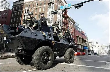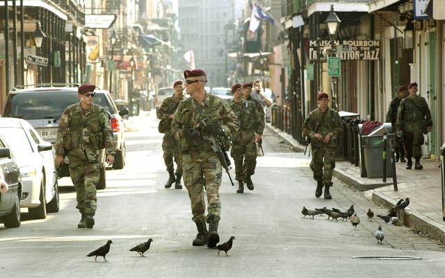 出现在新奥尔良市街道上的美军不是乘着装甲车从满目期待的灾民身边冷漠地驶过,就是端着已上膛的M-16自动步枪到处搜寻“可疑人员”。他们在相当长的时期内几乎不会顾及灾民,甚至还将一些试图越过一座桥梁进入位于密西西比河西岸的格雷特纳市的灾民挡在了警戒线外,如有人硬闯则会开枪射击。有媒体曾讥讽,“这些美国大兵将伊拉克战场的经验用在了这里”。