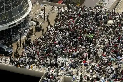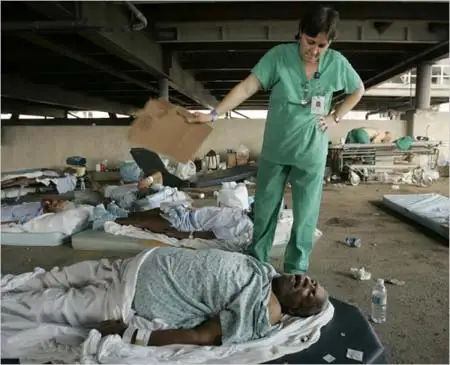 作为作为超级穹顶体育馆和会议中心弥漫着绝望和悲凉。上万名灾民在超级穹顶体育馆滞留多日,馆内污秽不堪、充满恶臭、闷热难捱。 当时的报道称,会议中心有人遭枪击而死;街区避难所发现遇害者;体育馆里两名孩子遭到强暴;一架转运灾民的“奇努克”军用直升机遭枪击;一名国民警卫队员遭枪击;市民的报告不停汇总到当局。会议中心收留了上万灾民。8月31日后,里面就频频响起枪声,当局出动数十名警察前往维持秩序,反被骚乱民众驱赶出来。