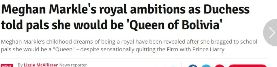 在作家汤姆·鲍尔2022年出版的《复仇:梅根、哈里和温莎夫妇之间的战争》一书之前,一位消息人士曾经向媒体透露说,梅根从小就着迷于玻利维亚的君主制。 消息人士表示:“她的雄心从未受到质疑。”。“最终她如愿以偿,嫁入王室,她一举成名。” “梅根在学校里和玻利维亚总统的儿子成为朋友,吹嘘了几天,‘我要成为玻利维亚女王。’” 梅根儿时的好友妮纳基·普里迪也接受了传记的采访,并声称这位前美剧《金装律师》明星演员“总是对王室着迷”,当她在学校戏剧中扮演主角时,“感觉自己像个公主”。