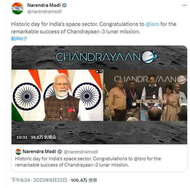 | 印度“月船3号”成功登月,莫迪祝贺:历史性的一天 zt |