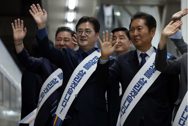 据韩国《朝鲜日报》27日报道,韩国首尔中央地方法院当天凌晨驳回检方对李在明的批捕申请后,执政党国民力量党取消了原定当天上午9时在首尔站等地进行的“中秋返乡游子问候”日程,紧急召开了该党最高委员会议,并决定从当天上午9时30分在国会召开议员总会,讨论李在明的拘捕令被驳回后的对策。 图为27日,共同民主党在韩国龙山站迎接返乡游子。图源:韩媒