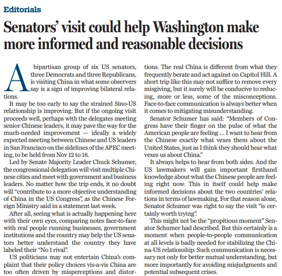 继美国国务卿布林肯、财政部长耶伦、美国总统气候问题特使克里、商务部长雷蒙多等美国政府高层官员访华之后,由美国国会参议院多数党领袖舒默率领的两党参议员代表团正在访问中国,一些观察家认为这说明两国关系正在改善。 此次美国议员代表团代表团由6名参议员组成,民主党和共和党议员各3名。如果访问顺利,或许可以为双边关系改善创造有利条件和氛围。正如中国外交部发言人所说,中方欢迎美国国会参议院多数党领袖舒默率两党参议员代表团访华。“希望通过此访增进美国国会对中国的客观了解,促进两国立法机构对话交流,为中美关系发展注入积极因素。” 耳听为虚,眼见为实。舒默一行10月7日从上海开启访华行程,在访问北京之后,下一站将会访问西安。亲眼目睹中国的实际情况,与中方官员和企业家面对面交流,有助于美国参议员更好地了解真实的中国。一次短暂之旅可能不足以消除所有的疑虑,但肯定会或多或少地减少一些误解。在减少误解方面,面对面的交流总是更好。 兼听则明,偏听则暗。多听听、多看看总没坏处。美国立法者将获得重要的第一手资料,了解中国人民的所思所感,有助于美方在立法方面对两国关系做出明智决定。从这一点来看,舒默说这次访问"值得一试"是正确的。 中美关系是当今世界最重要的双边关系,健康稳定的中美关系既有利于两国,也利于世界。稳定中美关系亟需各个层面的交流。这种交流与沟通不仅是增进相互理解所必需,也有助于减少误解和误判。 本文译自《中国日报》10月9日社论 原文标题:Senators’ visit could help Washington make more informed and reasonable decisions: China Daily editorial 出品:中国日报社论编辑室 |