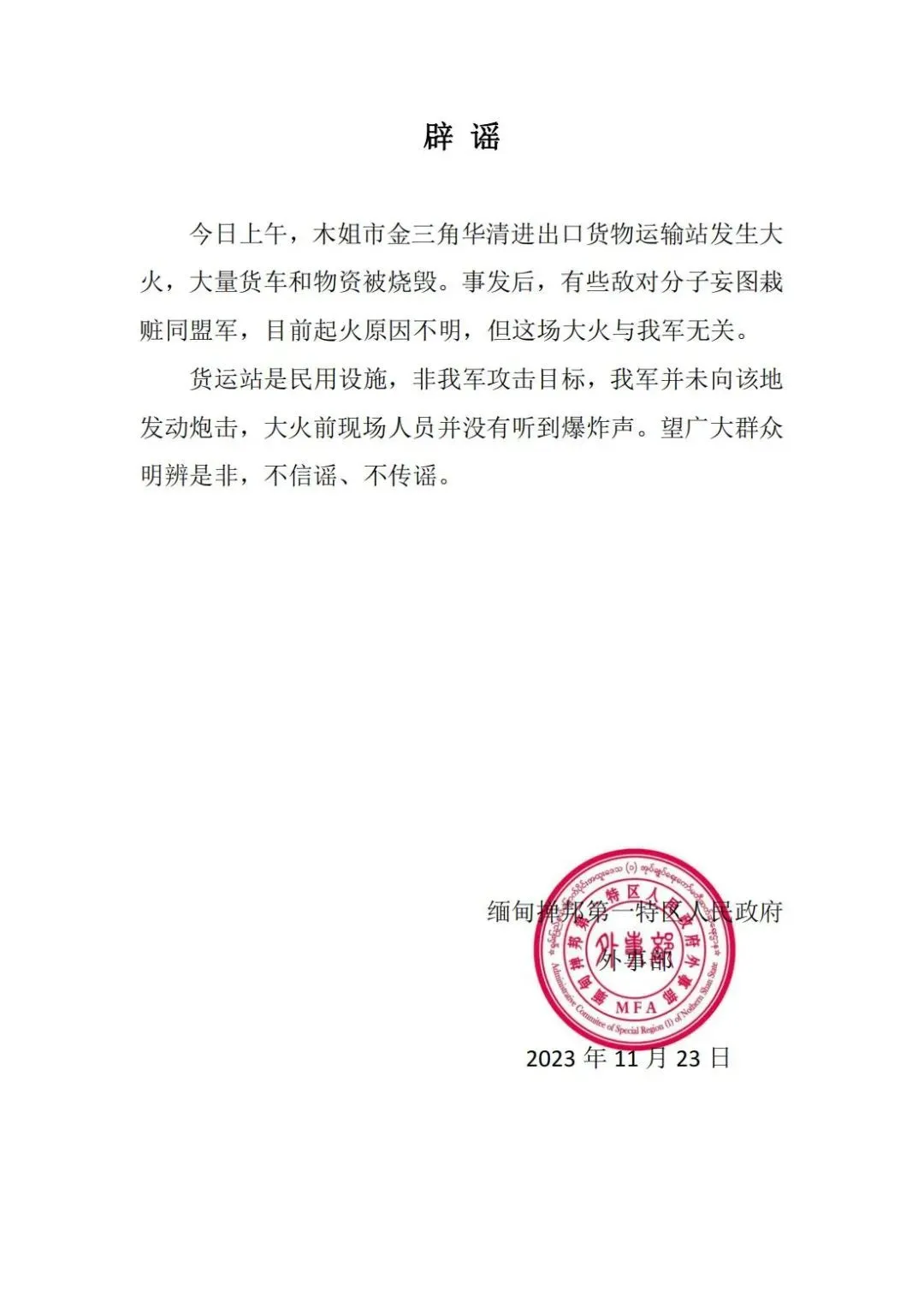 中缅边境大量货车被烧毁,果敢同盟军:与我军无关(缅甸掸邦第一特区人民政府外事部授权发布) 辟 谣 今日上午,木姐市金三角华清进出口货物运输站发生大火,大量货车和物资被烧毁。事发后,有些敌对分子妄图栽赃同盟军,目前起火原因不明,但这场大火与我军无关。 货运站是民用设施,非我军攻击目标,我军并未向该地发动炮击,大火前现场人员并没有听到爆炸声。望广大群众明辨是非,不信谣、不传谣。