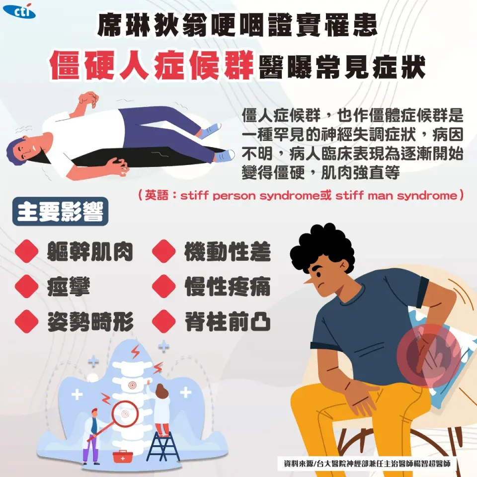 百万分之一的机率!僵人综合征是一种什么病?为何被称为僵尸症?国内患者约有千例 僵人综合征,也被称作僵尸症候群或者僵尸症(stiff person syndrome 或 stiff man syndrome),是一种罕见的致残性自身免疫性疾病,病因不明,病人临床表现为逐渐开始变得僵硬、肌肉强直等。 它会使有些病人形成驼背,无法独立行走。 僵人综合征最早在1956年才被描述,当初被叫做“stiff man syndrome”,病人主要的临床表现为脖子、肩膀和上背部逐渐僵硬,并且有阵发疼痛性肌肉痉挛以及行走困难。随后的观察发现男女病患都有,所以改称为stiff person syndrome(SPS)。由于有很多这类病人合并有其它的自体免疫疾病,这个疾病的免疫机制才逐渐被重视。 该病多呈急性或亚急性起病,表现为躯干肌或四肢肌肉在声音、光线、碰触刺激和情绪激动等情况下,诱发肌强直痉挛发作,每次持续数秒至数分钟。患者随时可发生肌肉痉挛,严重的时候甚至可使患者突然倒地而引起骨折。大约每100万人中就有1人受到影响,女性发病率是男性的两倍。据了解,国内收治病例超过1000例。 目前僵人综合征没有特效药,无法治愈,也无法预防。 僵人综合征因为罕见,早期诊断困难,很多人会把僵人综合征与渐冻症混淆 ,二者有明显区别:渐冻症是运动神经元病,属于神经变性疾病,而僵人综合征与遗传、病毒感染和自身免疫相关,属自身免疫性疾病。 此外,早期诊断还要排除强直性脊柱炎、风湿性关节病、副肿瘤综合征等。也许和破伤风、狂犬病的僵硬痉挛相鉴别。另据报道,僵人综合征患者部分人群同时会患有肿瘤。