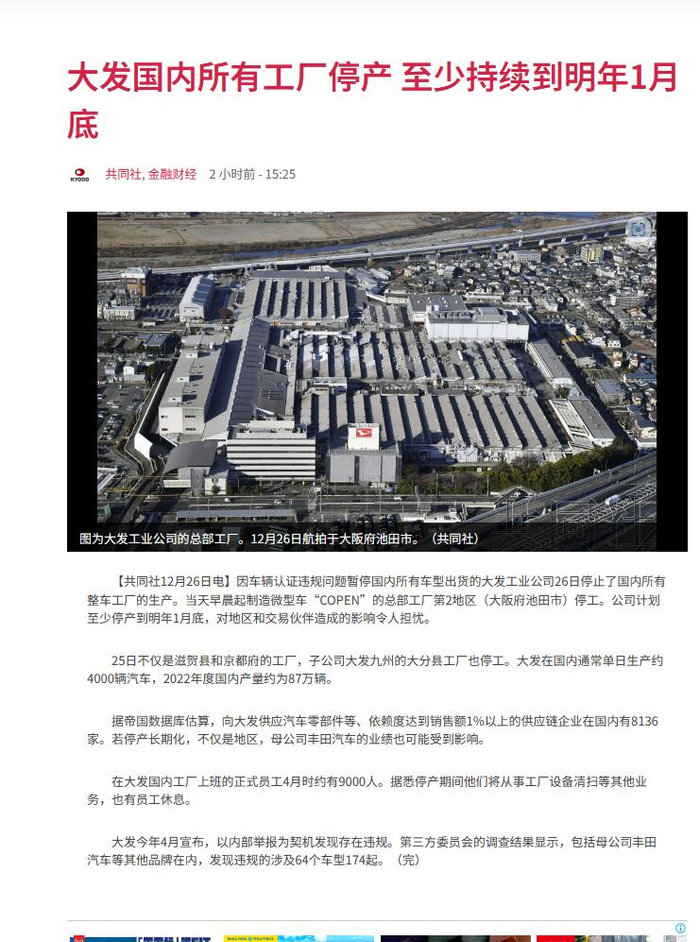 日媒:丰田汽车子公司在日本所有工厂停产中新网12月26日电 据日本共同社报道,26日,丰田汽车子公司大发工业公司停止了日本国内所有整车工厂的生产,并计划至少停产到明年1月底。4月时,在大发日本国内工厂上班的正式员工约有9000人。据悉,停产期间,他们将从事工厂设备清扫等其他业务,也有员工休息。大发曾在今年4月宣布,以内部举报为契机,发现存在违规。第三方委员会的调查结果显示,包括大发母公司丰田汽车等其他品牌在内,发现了174项违规,涉及64款车型。(中新财经) 共同社报道截图 |