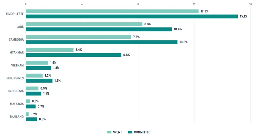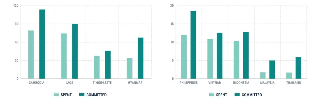 以项目承诺金额计算,ODF在地区范围内约合国内生产总值的1.5%,而实际支付的官方开发融资约占GDP的1%。ODF的作用程度在东南亚各国中存在明显差异。在东帝汶、老挝和柬埔寨等小型和发展水平较低的国家,ODF的作用更为显著。 东南亚国家接受的官方开发资金 占国内生产总值的百分比