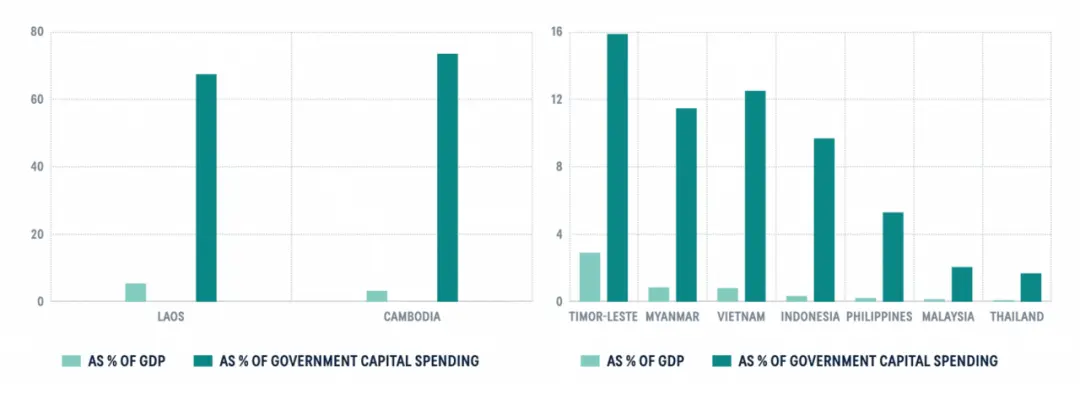 (一)官方开发融资在基建方面发挥着重要作用 尽管东南亚经济体的规模可观,但其获得的基础设施发展融资总量对该地区的基础设施投资,从而对其增长和发展产生了显著影响。相较于单个经济体的规模,官方开发金融(ODF)成为该地区较小的发展中经济体——老挝、柬埔寨和东帝汶的重要资金来源,这些国家的基础设施官方开发金融占其国内生产总值的一定比例。在老挝和柬埔寨,基础设施官方开发金融分别占政府资本支出的67%和74%。东帝汶政府则能从其庞大的石油基金中提取资金投资于公共基础设施,基础设施官方开发金融在此仍发挥重要作用。 在地区较大经济体中,基础设施ODF占GDP的比例相对较小,但在很多情况下,其占政府资本支出的比例仍较大。在印度尼西亚、越南和缅甸,基础设施ODF约占政府资本支出总额的10%或以上。而在菲律宾、马来西亚和泰国,基础设施开放式基金的支付额较小,反映出项目实施方面的问题。然而,若以项目承诺额为衡量标准,这些国家的基础设施官方开发金融占政府资本支出的10%或以上,与东南亚其他大型新兴经济体的水平相当。 官方开发金融对基础设施