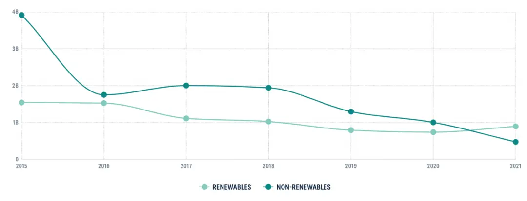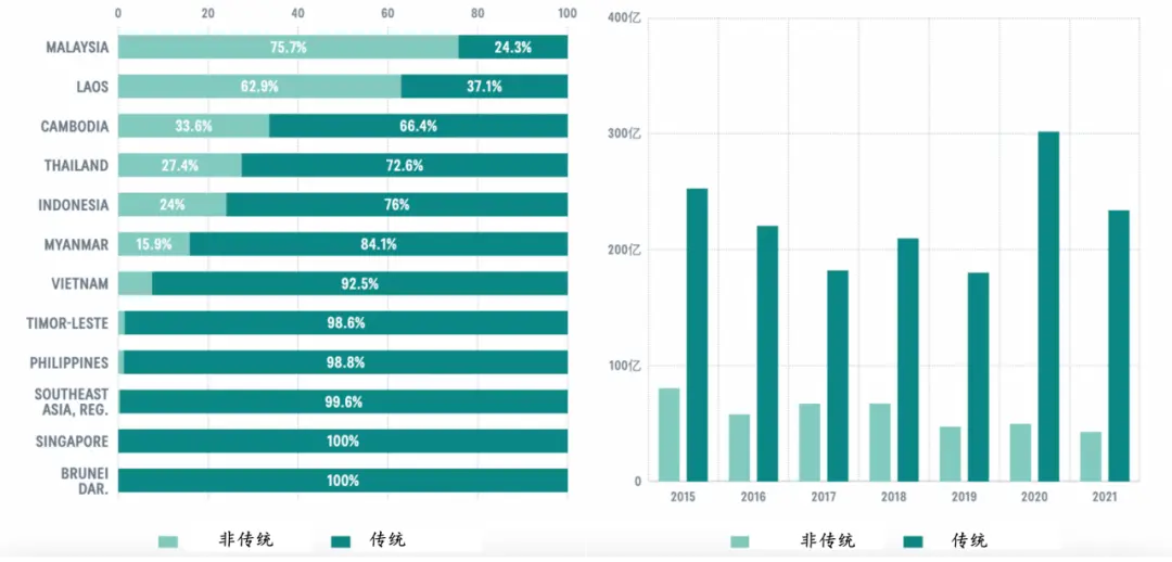 尽管全球努力推进低碳能源转型,东南亚地区用于不可再生能源项目的发展资金仍高于可再生能源项目。自2015年以来,该地区不可再生能源项目获得123亿美元融资,可再生能源项目获得76亿美元融资。中国是主要融资伙伴,其次是世界银行和韩国。近年来,两种能源项目的融资均大幅下降。 东南亚地区的能源开发融资