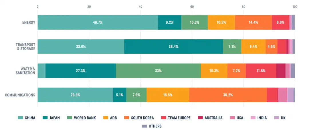 (二)中国的基建投入摇摇领先,但面临竞争 迄今为止,中国在东南亚地区担任最大官方基础设施发展资金提供国。2015年至2021年期间,中国向东南亚各国提供了约280亿美元的基础设施官方发展基金,相当于每年约40亿美元。这一数字几乎占据该地区同类融资总额的40%。 日本位列第二大基础设施官方发展基金来源国,每年提供25亿美元。相较之下,世界银行、亚洲开发银行及韩国每年各提供略高于10亿美元的资金。法国和德国位居第二大来源国,加上其他欧盟国家组成的“欧洲团队”,成为第六大基础设施官方发展基金来源国。后续依次为澳大利亚、美国、印度和英国,但每年提供的资金支持远低于1亿美元。 尽管中国是基础设施ODF的最大单一来源,在各领域的地位并非都占据主导。例如,在运输和仓储领域,日本的官方开发融资略多于中国。在通信领域,韩国提供的资金与中国相当,而亚洲开发银行和世界银行亦为重要参与者。中国在供水和卫生领域的角色相对较小,这反映了中国对经济而非社会基础设施的侧重。相较之下,传统发展伙伴更关注这一领域。然而,在能源领域,中国确实占据主导地位,占据官方发展基金的50%,韩国位居其次,占比为14%。 各国家和机构在不同领域基建投资ODF的占比