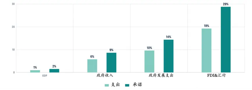 *注:政府发展支出指用于固定资本资产(代表公共基础设施投资)、教育、卫生(经常支出)和社会援助的金额。 ODF在此发挥了独特的作用,为最迫切的发展优先事项提供了支持。与市场融资相比,ODF的财务条件更具有优势,其中大部分以赠款和优惠融资的形式提供。即使在非优惠性的ODF中,其提供的条件通常也优于市场水平。 衡量ODF在该地区的重要性,不应仅与GDP相比,而应关注政府收入,特别是政府在主要发展优先事项上的支出。虽然ODF仅占地区GDP的1-1.5%,但相当于政府总收入的6-9%。更重要的是,ODF相当于政府在基础设施、教育、卫生和社会援助方面总发展支出的10-15%。此外,官方发展基金还相当于外国直接投资和汇款流入总量的一半,这表明大量外部资金仍通过官方发展渠道投入,而非通过市场和私人活动。 东南亚国家官方开发融资占政府发展支出的百分比