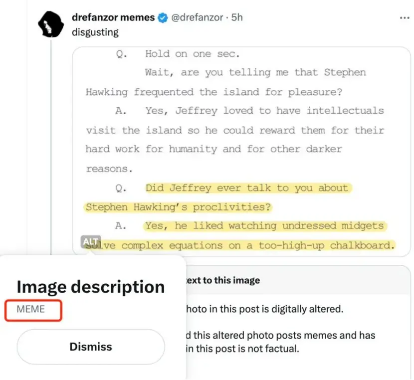 左下角那个圈起来的单词是「MEME」,这是个网络流行语,翻译过来是「梗」的意思。 也就是,所谓霍金爱看萝莉解方程的真相,其实是出自一位推特用户的玩梗图。 都知道玩笑三分真,那这个玩梗图的来源,其实也跟解密文件里提到的一些事有关。 目前曝光的解密文件中,霍金被提到两次,有实际内容的,是一份爱泼斯坦在2015年写给麦克斯韦尔的电子邮件——