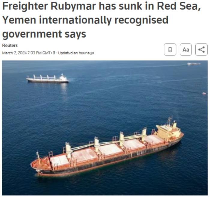 | 漂流12天后,遭胡塞武装击中的货船在红海沉没 zt |