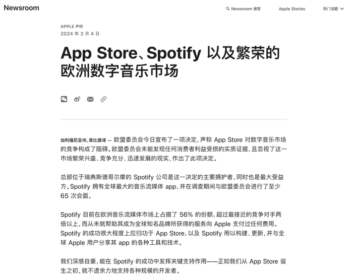 突发!遭天价罚款,苹果发长文"回怼"据央视新闻报道,当地时间3月4日,欧盟委员会执行副主席兼竞争专员维斯塔格在社交媒体上表示,欧盟于当天对苹果公司处以18.4亿欧元(当前约143.7亿元人民币)罚款,原因是其在音乐流媒体应用分发市场中滥用主导地位。 欧盟表示,苹果公司非法阻止了应用开发者向用户提供在苹果应用商店之外更便宜的音乐订阅服务信息。 欧盟这一决定源于瑞典音乐流媒体服务平台Spotify于2019年对苹果公司提出的投诉,该投诉涉及苹果对其应用商店征收30%佣金等内容。 据每日经济新闻,苹果表示将对欧盟罚款提出上诉,称欧盟监管机构未能提供任何可信的消费者利益受损的证据,且其忽视了蓬勃发展的竞争市场。欧盟决定的最大受益者是Spotify,因为其在其网站上销售订阅服务时不需要向苹果支付费用。 截至发稿,苹果美股盘前股价下跌近1%。 ![]() 苹果回应:Spotify 从未向 Apple 支付任何费用,欧盟的决定很讽刺 3月4日,苹果公司在其官网发布的一篇声明中称,总部位于瑞典斯德哥尔摩的Spotify公司是这一决定的主要拥护者,同时也是最大受益方。Spotify拥有全球最大的音乐流媒体app,并在调查期间与欧盟委员会进行了至少65次会面。 Spotify 目前在欧洲音乐流媒体市场上占据了56%的份额,超过最接近的竞争对手两倍以上,而从未就帮助其成为全球知名品牌所获得的服务向Apple支付过任何费用。Spotify的成功很大程度上应归功于App Store,以及Spotify用以构建、更新,并与全球Apple用户分享其app的各种工具和技术。 ![]() 从2015年起,Spotify与欧盟委员会展开合作,在几乎毫无现实依据的情况下进行一项调查。他们声称数字音乐市场已经陷入停滞,Apple在限制竞争对手的发展。与他们的指控形成对比的是,Spotify本身就在持续发展,并在App Store的助推下,超越了全球所有其他的数字音乐服务商。 图片来源:每经记者 张建 摄在接下来的八年里,欧盟委员会和 Spotify进行了超过65次会面,并三次试图对Apple提出指控。每一次他们都缩小了指控的范围,但每种理论都存在两个共同点: 没有证据表明消费者利益受损:在呈几何级数增长的数字音乐市场中,欧洲消费者拥有比以往更多的选择。在短短八年里,订阅用户人数从2500万增长到了近1.6亿,活跃用户人数更超过3亿,而Spotify正是这一增长的最大赢家。 没有证据表明存在反竞争行为:调查持续八年,却从未得出一个站得住脚的理论,能够解释 Apple 如何在这个显然十分繁荣的市场中阻挠了竞争。 欧盟委员会在其新规则——数字市场法案(DMA)生效前夕公布了这一决定。Apple将在数天后开始遵守DMA,我们计划变更本文中提到的遭到挑战的规则。欧盟委员会的决定显然无法得到现有竞争法的支持。委员会此举是在DMA成为法律前强行实施此法案。 而现实是欧盟消费者拥有比以往更多的选择。讽刺的是,今天公布的决定以竞争之名,巩固了一家成功欧洲企业在数字音乐市场的领跑者地位。 苹果回应关于App Store 收费问题 苹果公司在声明中表示,长期来看,App Store为开发者们提供了更多价值。但绝大多数开发者(约86%)从未需要向Apple 支付费用。 目前,App Store的开发者仅需在两种情况下向 Apple 支付费用。即用户从App Store购买付费app,或购买app内数字产品或服务(如订阅或游戏内的道具)时。 如果开发者在其app内出售实体商品,提供广告,或免费分享app,则无需向Apple支付任何费用。同样,如果开发者在网络上出售订阅供用户购买,用户再通过设备上的app使用订阅服务,开发者也无需向Apple付费。音乐app开发者还可以告知用户app之外的购买信息,并提供链接引导用户前往外部网站,创建并管理账户。 |