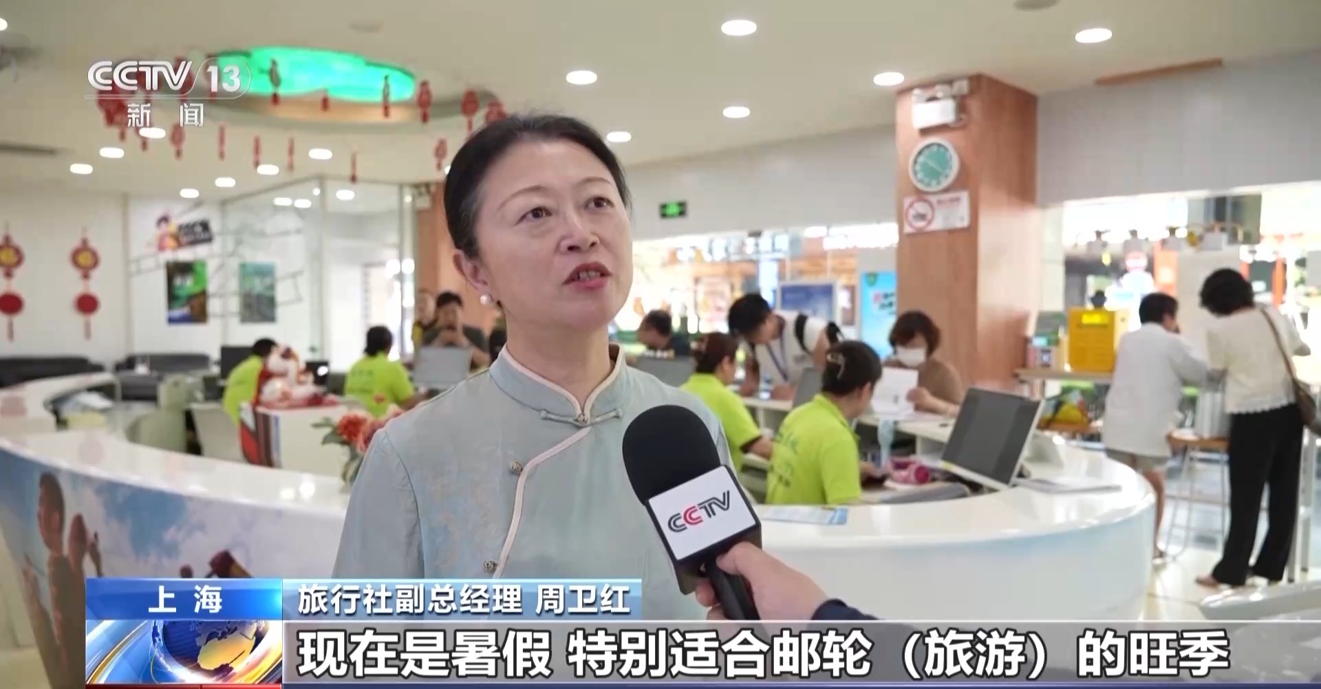 旅行社副总经理 周卫红:现在是暑假,邮轮旅游的旺季。在上海停留一下,组合成一个“陆地+邮轮”的产品,今年暑假特别受欢迎。