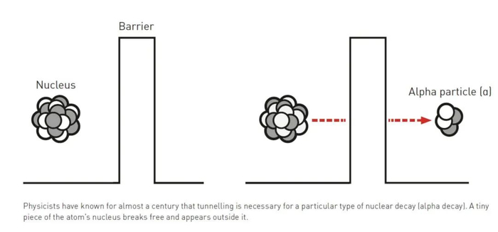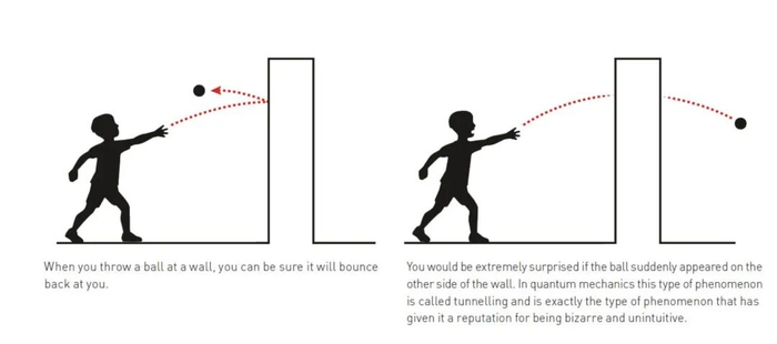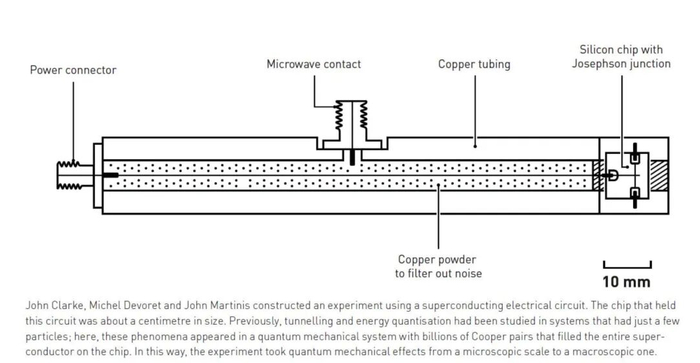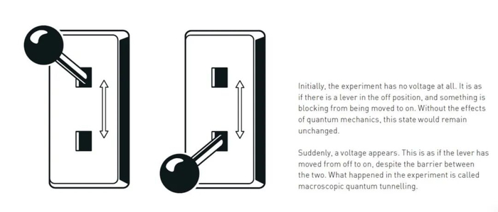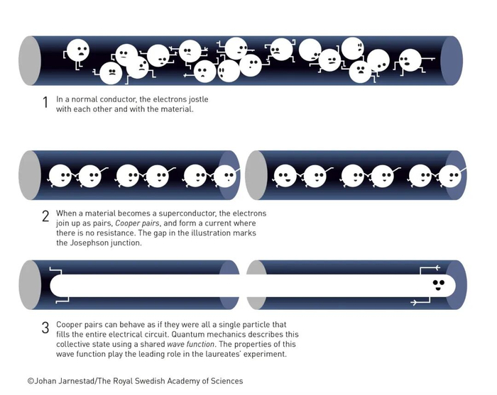 一句话说清物理诺奖:人类首次在宏观世界看到“子弹穿墙”在量子物理的世界里,常常会发生一些违反直觉的事情:粒子能穿过墙壁、能量像硬币一样一枚一枚地发放、一个系统能同时处在两个状态之中。这样的现象看似只存在于微观世界,远离我们的日常经验,但今年的诺贝尔物理学奖告诉我们,这些“奇异”的量子现象,可以在你手心大小的电路中发生。 ![]() 这张图用生活中的一个例子(球扔向墙壁会反弹)来解释量子力学中的隧道效应。在量子力学的微观世界里,微观粒子有一定的概率穿过原本看似不可逾越的“墙壁”,出现在墙壁的另一侧。这与我们日常中基于经典物理形成的直觉相违背,所以让人觉得量子力学很“怪异”。图源:Johan Jarnestad/The Royal Swedish Academy of Sciences 2025年诺贝尔物理学奖授予了三位科学家:约翰·克拉克(John Clarke)、米歇尔·德沃雷(Michel H. Devoret)和约翰·马丁尼斯(John M. Martinis),以表彰他们“在电路中发现宏观量子隧穿与能量量子化”的成就。他们让量子力学从原子与电子的微观舞台,跃上了可以触摸的人类尺度。 当量子世界伸向人类尺度 我们都知道,扔出的球会撞在墙上反弹回来,不可能“穿墙而过”。但在量子世界中,粒子却能做到这一点,这就是著名的“量子隧穿”。 在原子核中,粒子偶尔会穿越能量屏障逃逸出来,这种“穿墙术”正是放射性衰变(如α衰变)的根源。 ![]() 物理学家已经知道,隧道效应对于一种特定类型的核衰变(α衰变)来说是必需的。原子核中的一小部分会脱离原子核并出现在原子核的外面。这里强调了隧道效应在α衰变过程中的重要性,解释了α衰变过程中α粒子是如何从原子核内部穿越势垒(Barrier)而逃逸到原子核外部的现象。图源:Johan Jarnestad/The Royal Swedish Academy of Sciences 然而,这种现象通常只出现在单个粒子层面。几十年来,物理学家都在追问:能否让由无数粒子组成的宏观体系,也表现出同样的量子行为? 2025年的三位诺贝尔奖得主给出了一个漂亮的答案:可以。 在超导电路中建造“量子隧道” 时间回到上世纪80年代中期。美国加州大学伯克利分校的实验室里,教授约翰·克拉克带领他的团队,包括博士后米歇尔·德沃雷和博士生约翰·马丁尼斯,开始搭建一个看似普通的电路。这个电路由两块超导体组成,中间夹着一层极薄的绝缘层,这种结构被称为约瑟夫森结(Josephson junction)。 ![]() 1、在普通的导体中,电子之间会相互碰撞,同时也会与导体材料发生碰撞。2、当一种材料变成超导体时,电子会成对结合,形成库珀对,并且形成一种没有电阻的电流。图中的空白部分表示的是约瑟夫森结。3、库珀对可以表现得像一个单一的粒子,充满了整个电路。量子力学使用共享的波函数来描述这种集体状态。这个波函数的性质在获奖者的实验中起着主导作用。图源:Johan Jarnestad/The Royal Swedish Academy of Sciences 在超导体中,电子并非各自为战,而是成对“结伴而行”,形成所谓的库珀对(Cooper pair)。这些电子对不再像普通电子那样互相推挤,而是像一支完美合拍的舞蹈队伍,共同流动、没有阻力。整个系统可以用一个统一的“波函数”来描述。这意味着,它表现得就像一个巨大的“量子粒子”。 于是,这个由无数电子组成的宏观体系,竟然具备了量子世界的特性。克拉克、德沃雷和马蒂尼斯正是利用这一特性,设计出可以观察“宏观量子隧穿”的实验。 ![]() 这张图片描述了一个关于超导电路的实验。实验使用了一个超导电路,这个电路被放置在一个芯片上,芯片的尺寸大约为一厘米左右。此前,隧道效应和能量量子化等现象通常是在只有少数粒子的系统中进行研究的。而在这个实验中,这些量子现象出现在了一个宏观的量子力学系统中。这个系统包含数十亿个库珀对,这些库珀对充满了芯片上的整个超导体。通过这种方式,该实验将量子力学效应从微观尺度扩展到了宏观尺度。图源:Johan Jarnestad/The Royal Swedish Academy of Sciences 他们向电路中输入微弱电流,并测量电压变化。在没有量子效应时,电压应当始终为零,就像一个被卡住的开关。然而在实验中,他们惊讶地发现:电压会突然跳动,好像系统“穿过了”一个无形的能量屏障。 ![]() 这张图片描述了一个实验现象,实验开始时没有电压,就像一个被障碍物阻挡的杠杆处于关闭位置。在经典物理学中,这种状态会一直保持。但是量子力学允许电压“隧穿”过障碍物,使得电压突然出现,这种现象被称为宏观量子隧穿。图源:Johan Jarnestad/The Royal Swedish Academy of Sciences 换句话说,电路中的整个超导体系,完成了一次宏观量子隧穿。 能量的“量子化”——跳台式的世界 更令人兴奋的是,他们还发现这个系统的能量不是连续变化的,而是分成一个个“台阶”,只能按特定的份额吸收或释放能量。这种现象被称为能量量子化(energy quantisation)。 实验团队向电路中注入不同波长的微波。当微波的能量恰好与某一级能量差匹配时,电路就会“吸收”这份能量,并跳到更高的能级,就像粒子在量子世界中跃迁一样。这正是量子世界的特征:能量不流动,而是“跳跃”。 ![]() 在量子力学体系里,粒子的能量并非是连续可变的。就好比你爬楼梯,不能停留在两个台阶之间的位置,而必须完整地从一个台阶迈到另一个台阶。粒子的能量也是一样,它只能处于某些特定的能级上,吸收或释放的能量也是特定的、
