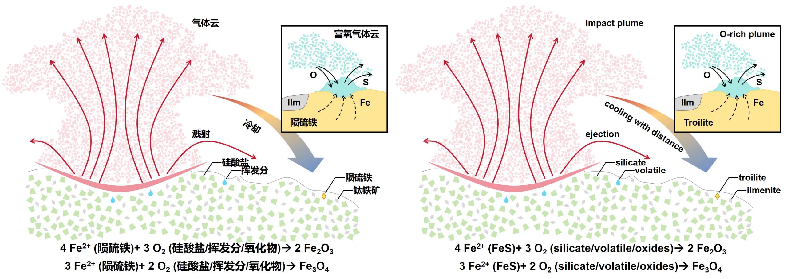 图3 嫦娥六号样品中发现的铁氧化物成因示意图。图中表示了月球表面物质在大尺度撞击下气化,产生局部的高氧逸度气氛。高温环境使得陨硫铁(FeS)矿物脱硫,并在适当的温度条件(700~1000℃)下被高氧逸度的气氛氧化,形成了赤铁矿(α-Fe2O3)、磁赤铁矿(γ-Fe2O3)和磁铁矿(Fe3O4)。 自人类登月以来,月球被认为整体还原,极度缺少氧化作用的关键证据,特别是赤铁矿等高价态铁氧化物。研究提出,赤铁矿的形成可能与月球历史上的大型撞击事件密切相关。大型撞击形成瞬时高氧逸度气相环境的同时,铁元素在高氧逸度环境中被氧化,使陨硫铁发生了脱硫反应,经气相沉积过程形成微米级晶质赤铁矿颗粒。值得关注的是,该反应的中间产物为具有磁性的磁铁矿和磁赤铁矿,可能是南极-艾特肯盆地边缘磁异常的矿物载体。该研究首次利用样品证实了在超还原背景下月球表面存在赤铁矿等强氧化性物质,揭示了月球的氧化还原状态以及磁异常成因。