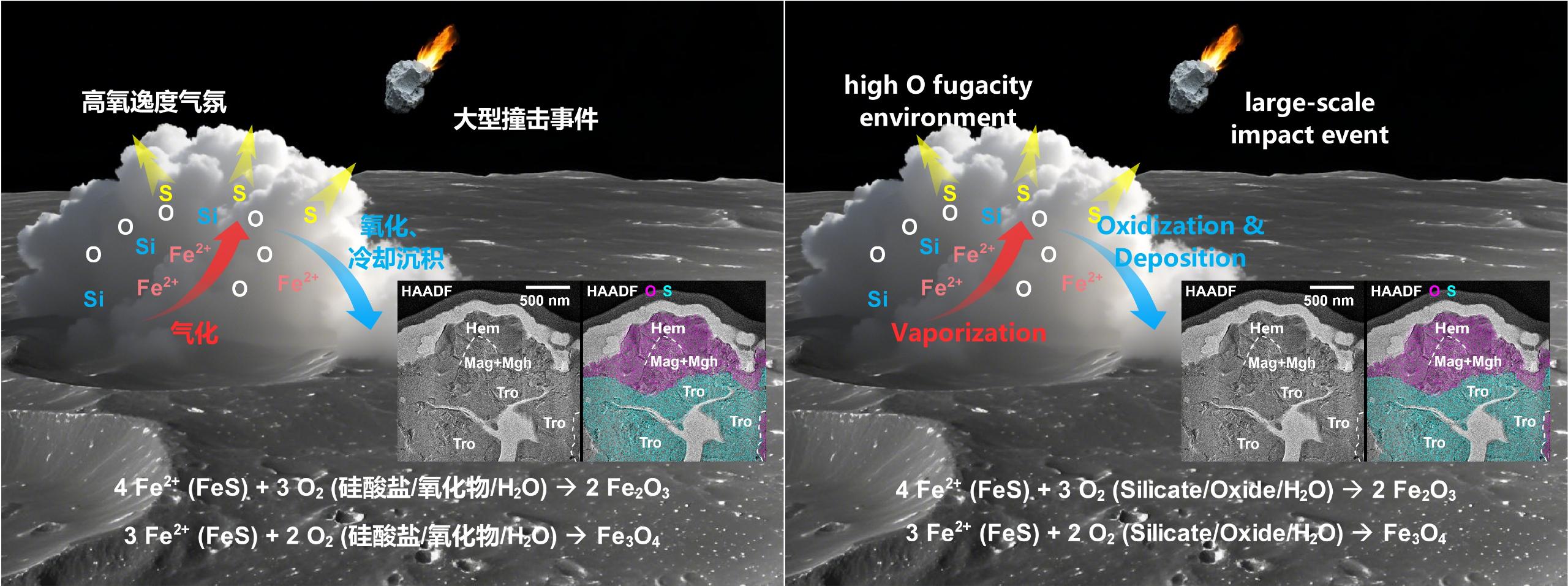 图4 嫦娥六号样品中发现的铁氧化物成因示意图。 嫦娥六号着陆的南极-艾特肯盆地,是太阳系岩石质天体上已知最大、最古老的撞击盆地,其形成时的撞击规模远超月球其他区域,为探索特殊地质过程提供了独特场景。2024年嫦娥六号任务成功从南极-艾特肯盆地内部采回月球样品,为此次突破性发现创造了前提。(蔡金曼 吕晓烨) |