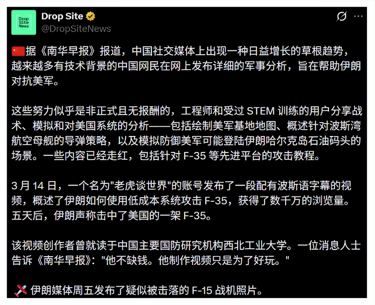 特别其中有个叫“老某某界”的账号,直接火出圈了!3月14号,他发了一段带波斯语字幕的视频,把“伊朗用低成本系统干翻F-35”的方法讲得清清楚楚,几天就爆了数千万播放。据悉,这位博主是西工大毕业的(懂的都懂,我国国防核心院校),消息人士说他根本不缺钱,做视频就是图一乐,可这份随手的善意,直接给伊朗指了条明路!