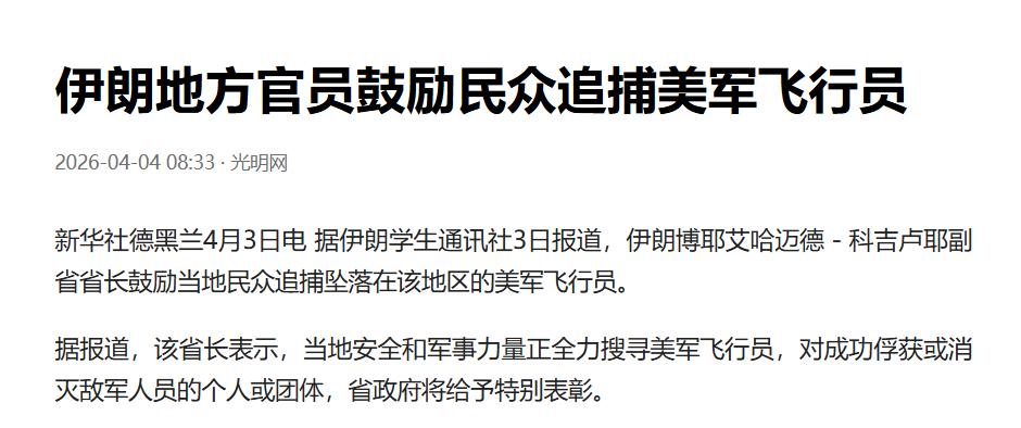 4月3日,美军F-15E被击落后,伊朗的反应堪称“教科书级别”的雷声大雨点小。击落美军战机地点所在的科吉卢耶-博韦艾哈迈德省副省长直接公开喊话,鼓励当地民众追捕坠落在该地区的美军飞行员,声称对成功俘获或消灭敌军人员的个人或团体,省政府将给予“特别表彰”。