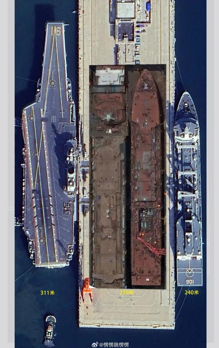 ▲新船尺寸对比辽宁舰与901型补给舰