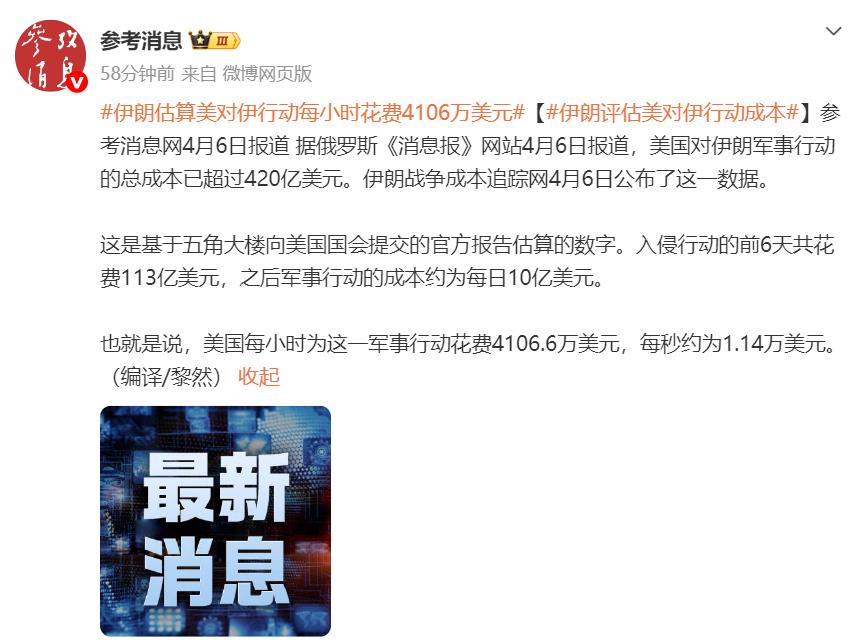 《纽约时报》援引五角大楼内部文件报道,美军在战争头6天就花费了超过113亿美元。