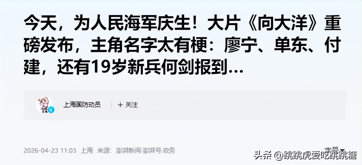 澎湃新闻 2026.04.23 关于今天,为人民海军庆生!大片《向大洋》重磅发布,主角名字太有梗:廖宁、单东、付建,还有19岁新兵何剑报到…的报道