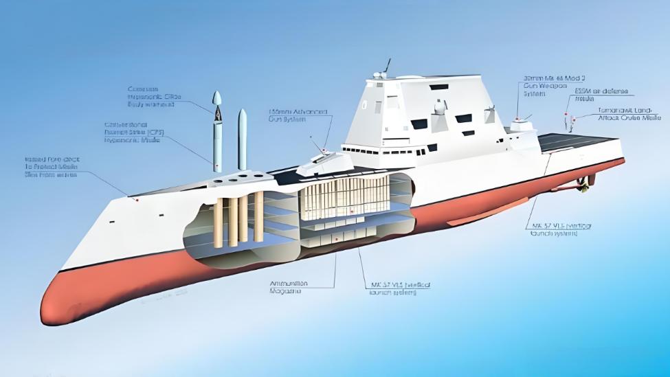 眼看中国的055型导弹驱逐舰一艘接一艘的服役,个个能发射高超音速导弹,美国海军急成了热锅上的蚂蚁,于是就打起了“朱姆沃尔特”级驱逐舰的主意,作为一艘满载排水量达到1.4万吨的驱逐舰,“朱姆沃尔特”将原本给为2门155毫米口径舰炮准备的位置腾出来后,安装了4个弗吉尼亚级核潜艇的大型导弹发射管,每个发射管能够融入3枚CPS高超音速导弹或者6枚“战斧”式巡航导弹。