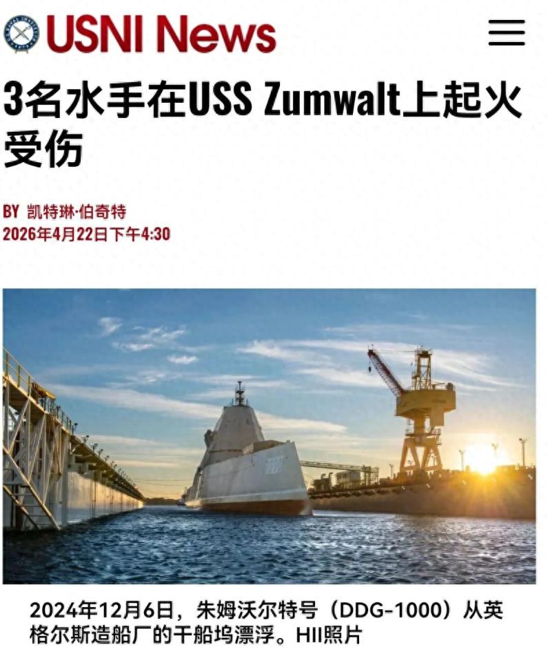 近日,据USNI News网站报道,正在密西西比州帕斯卡古拉造船厂码头停靠的朱姆沃尔特号驱逐舰发生火灾,三名水兵在此次事故中受伤。