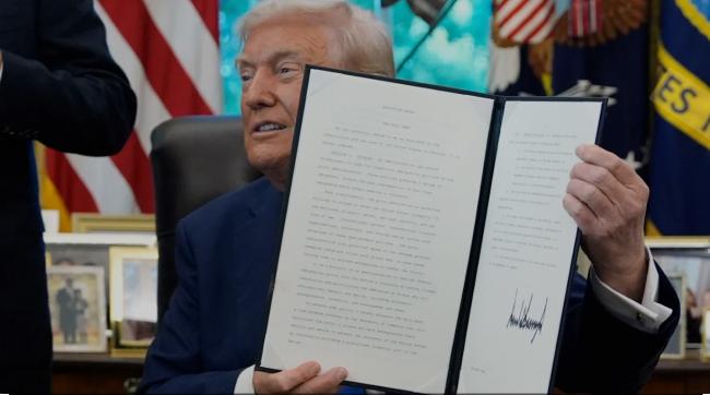 美国总统川普19日在白宫椭圆办公室展示签署的行政命令,授权新的川普金卡计划。欧新社 |
