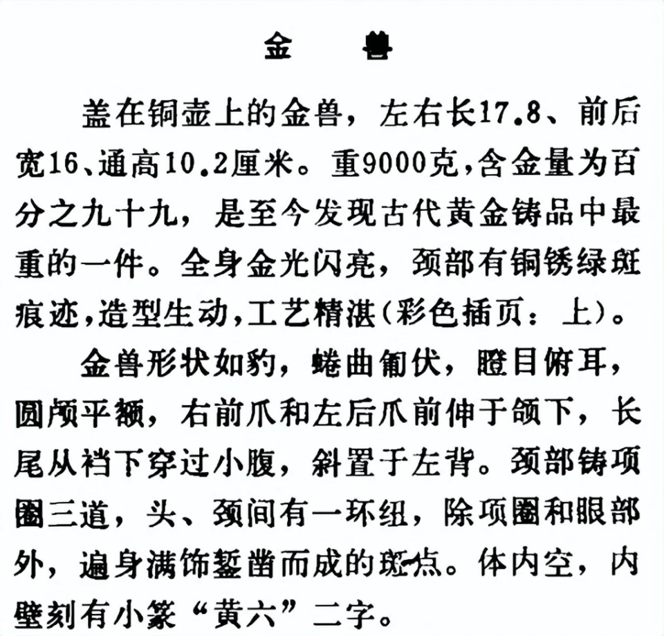 文章在详细介绍“金兽”时亦提及,全身金光闪亮,颈部有铜锈绿斑痕迹,造型生动,工艺精湛。 |